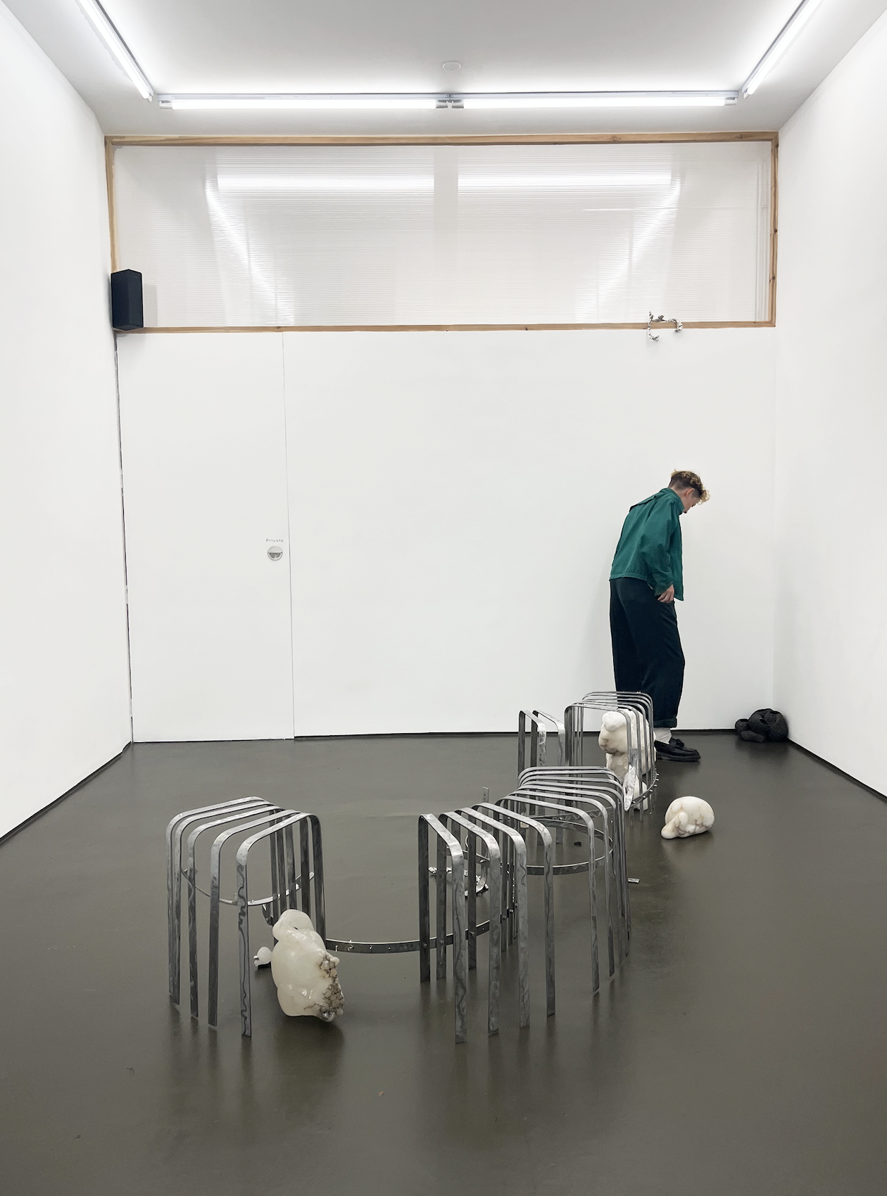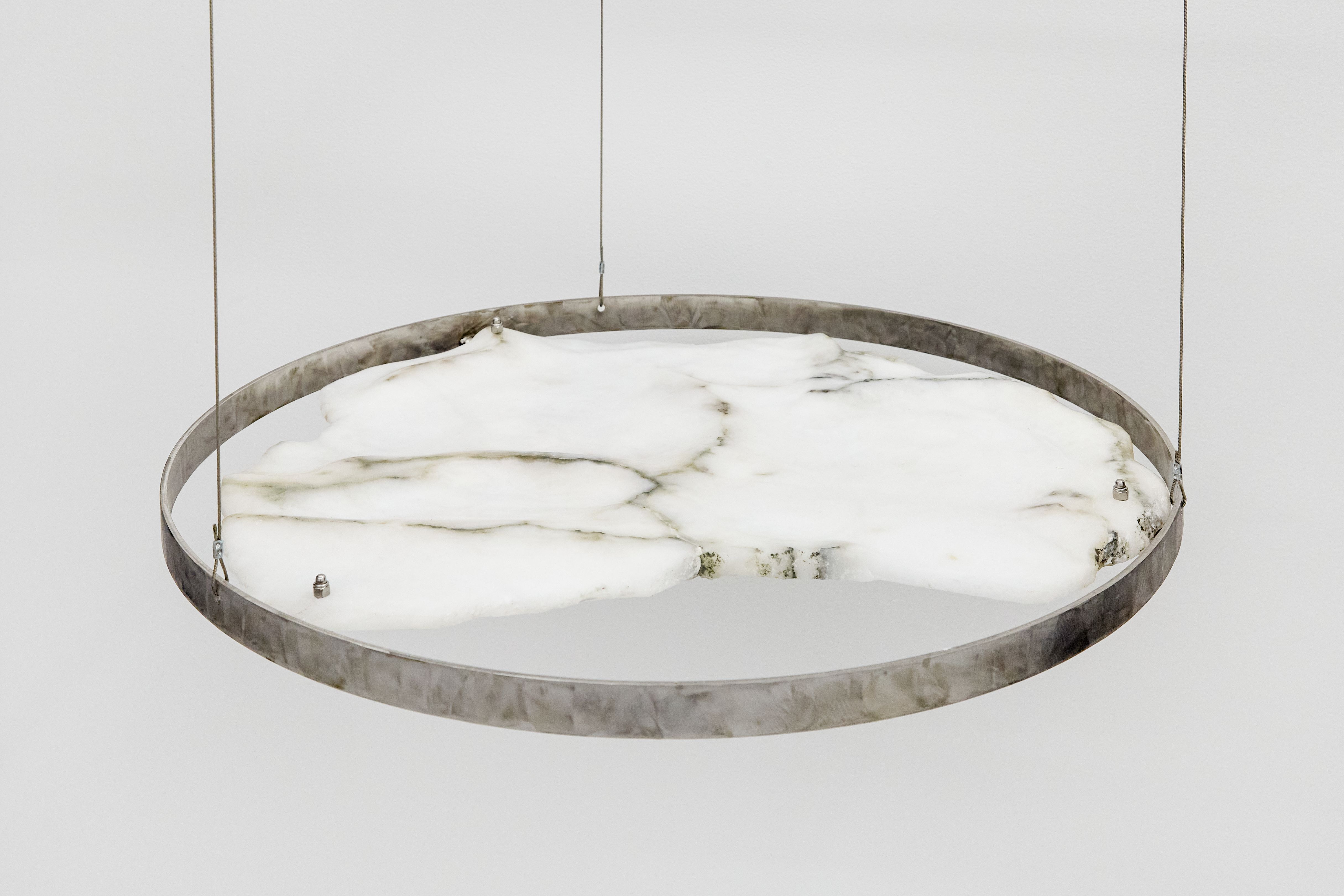 Working with active and inactive mine sites, ongoing iterations of Animula survey the role of descending underground as a transforming act. From these encounters and wider research into the material history and speculative bodies that occupy the imagination of the underland; I generative alabaster carvings that morph and change in their environment as a material reminiscent of monuments. From hanging stone ‘oculars’ serve as openings to other realms, intervening with light in the space. To vocal recordings envelop and reflect off the work, while a portal into descent is experienced from a metal ‘tunnel’, reflective maps and curious video screens within a new liminal space.